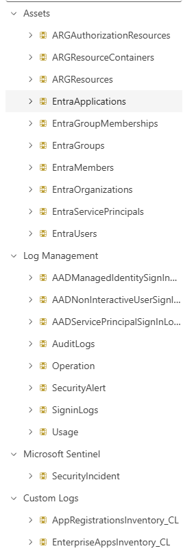 In addition to the transferred Analytics Logs, Microsoft - at last - provides some inventory information from Entra ID. Until now that was something that was always missing, especially for correlations. In the below screenshot you can see all the native table, as well as two custom log tables in the bottom (which are Analytics Logs).